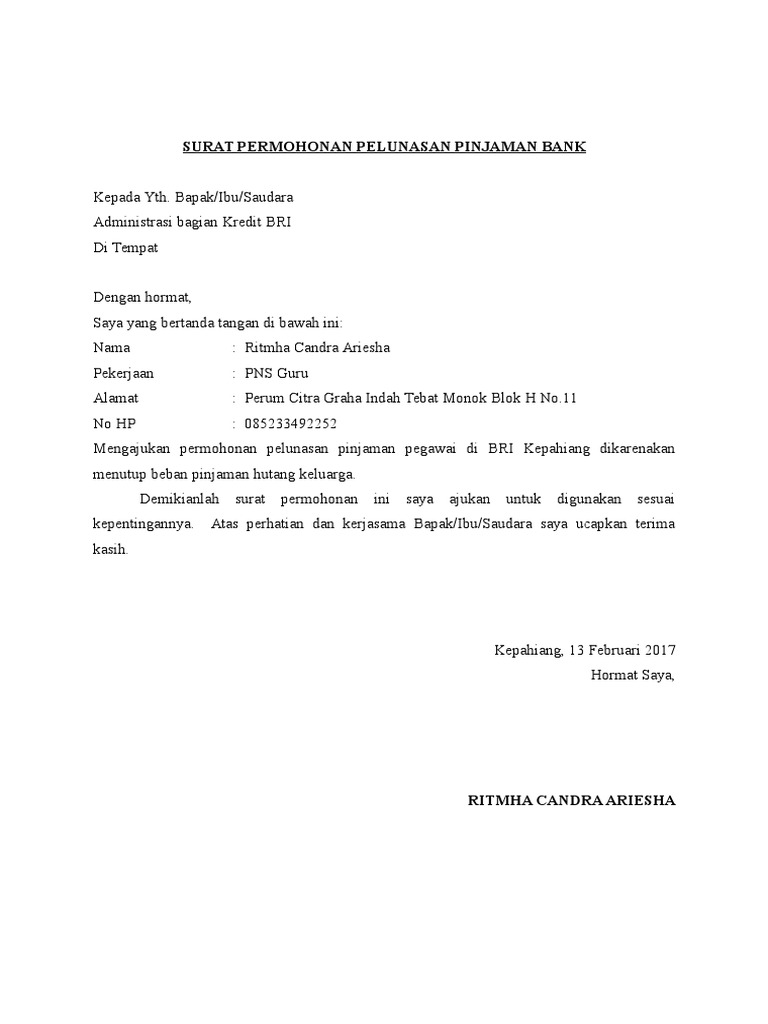 Surat Permohonan Pelunasan Pinjaman Bank Pdf